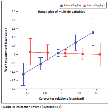 Explicit to the univariate moderation results (Figures 1 and 2 above), the question that needs to be investigated, considering what the two subscales from the job crafting scale used in the study assess, is what low job crafting means in the context of special needs schools, and how it could possibly be effectively operationalised to ensure that the special needs teacher still benefits from job crafting. The findings from the univariate moderation analysis could also suggest that perhaps viewing job crafting as characterised merely as a resource (i.e. increasing social resources and increasing structural resources) is not adequate enough to thoroughly measure job crafting. However, job crafting could possibly be viewed as a day-to-day behaviour, which is deliberately initiated and which extends into every sphere of an employee's work life.