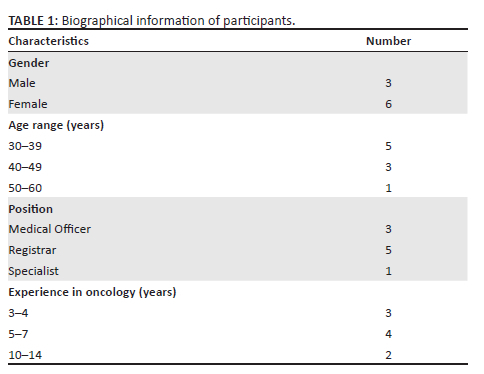 Purposive sampling was used to select participants rich in experience about the research phenomenon and willing to share their experiences (Alase, 2017; Laverty, 2003). Small, purposeful samples are appropriate to HP and IPA studies (Alase, 2017; Peat et al., 2019) as the focus is on eliciting rich narratives about the lived experiences related to the research phenomenon (Laverty, 2003). Only qualified doctors working in the oncology unit for at least three years were included as participants. The gatekeeper facilitated identification of and contact with participants who met the inclusion criteria. Nine doctors participated and included six females and three males. Three were medical officers, five were registrars and one was a specialist. The participants' biographic details are depicted in Table 1.
