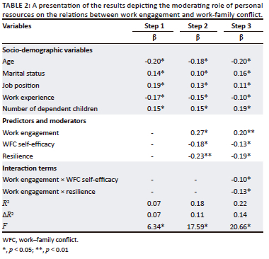 CONTRIBUTION/VALUE-ADD: This study is one of the first to examine the moderating roles of personal resources such as work-family conflict self-efficacy and resilience on the relationship between work engagement and work-family conflict within the framework of conservation of resources theory