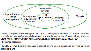 Sub-theme 4.1: Human resources practitioners' role and dilemma in organisations: Figure 2 characterises the dissimilar HR practitioners' roles attending various people in bullying scenes. The figure is adapted from Mokgolo (2017, p. 134) to describe the synchronicity of HR practitioners' roles: 'being the target trustworthy listeners, impartial investigators, and management advisors and facilitators in the bullying cycle'.