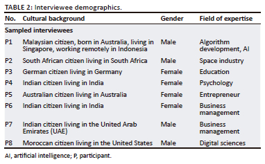 Interviewees were employed in the space industry, automotive industry, education, business management and IT services. Their cultural backgrounds were South African (1), German (1), Indian (2), North American (US) (1), Malaysian (1), Australian (1), and Moroccan (1) (see Table 2). Six interviewees defined themselves as male, two as female. All of them had been working in their industry for more than 10 years at the time of the interviews. Interviewees were selected using convenience and snowball sampling techniques (Etikan et al., 2016).
