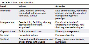 Working in 4IR organisations needs a specific set of values and attitudes according to the participants of the study. In citing individual, interpersonal, organisational, societal and spiritual values and attitudes, participants partially supported the views of, for example Hecklau et al. (2016) on technical, methodological and social skills. However, leaders in this study did not emphasise sustainability or sustainable solutions, nor political and legal standards, nor did they mention data security and privacy issues. Instead, they held a strong focus on openness, positive mindset and humanistic aspects of 4IR leadership (as in Ntombela & Civilcharran, 2023). Interestingly, leaders in this study focussed very little on the organisational level of the 4IR, while they mentioned spiritual values and spiritual interconnectedness, which are seldom mentioned in the literature.
