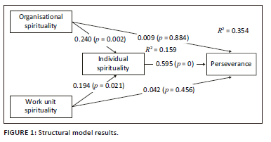 From the findings presented in Figure 1, it is evident that individual spirituality explained 35.4% of the variance in perseverance. Thus, the in-sample predictive power of the model can be described as weak to moderate. The R squared of individual spirituality was 15.9%. Based on the guidelines included in the analysis plan, the in-sample predictive power of the model is weak for individual spirituality. Individual spirituality strongly influenced perseverance (β = 0.595; p = 0.000 [two-tailed]). Organisational spirituality was a stronger determinant of individual spirituality than work unit spirituality (β = 0.240; p = 0.002 [two-tailed] vs β = 0.194; p = 0.021 [two-tailed]).