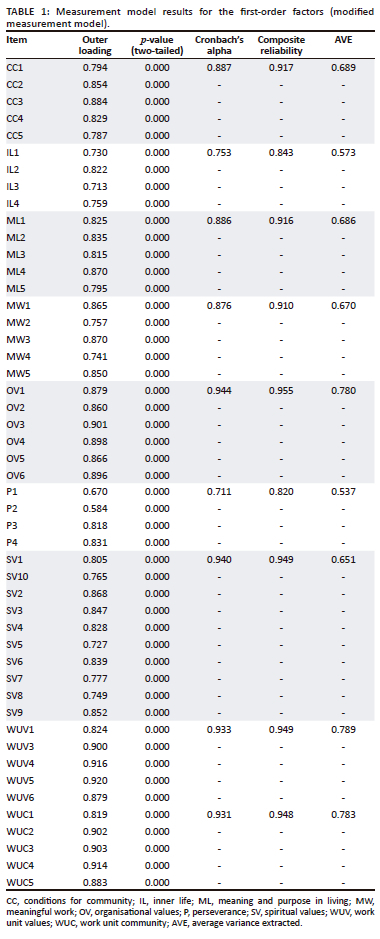 The researchers planned the data analysis, and an independent statistician conducted the statistical analysis. After receiving the returned questionnaires, the researchers captured the responses on an Excel spreadsheet, which the statistician used to execute the statistical analysis. A descriptive statistical analysis was first done to calculate the measures of central tendency. The hypotheses were then tested using the statistical software program SmartPLS version 3.2.7. SmartPLS is variance-based structural equation modelling software that explains total variance and uses it to estimate parameters (Hair et al., 2019). The use of PLS-SEM in this study was decided by the following two considerations: model complexity and data distribution issues. The model tested in this study comprises three second-order reflective-reflective factors (i.e. organisational spirituality, work unit spirituality and individual spirituality) and perseverance, which was measured as a unidimensional factor. Two second-order factors comprise three dimensions (i.e. organisational spirituality and individual spirituality) and the other second-order factor (i.e. work unit spirituality) was measured with two dimensions.