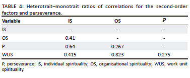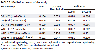 The results in Table 6 show that individual spirituality explains the mechanism by which organisational spirituality and work unit spirituality influence perseverance. When individual spirituality is included as a mediator of the influence of organisational spirituality and work unit spirituality on perseverance, the direct effects of organisational spirituality and work unit spirituality on perseverance are not statistically significant. The indirect effects, however, are statistically significant. Therefore, individual spirituality fully mediates the influence of organisational spirituality and work unit spirituality on perseverance.