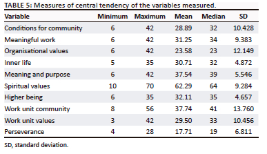 Data were collected using a structured questionnaire. The final questionnaire consisted of three sections. Section A consisted of socio-demographic questions that were used to describe the sample. This section asked four questions about the participants' gender, race, age and work experience. Section B consisted of a measure of workplace spirituality at the organisational, work unit and individual level, namely an abridged version of the Spirituality at Work (SAW) questionnaire, developed by Ashmos and Duchon (2000). Organisational spirituality was measured using 18 questions, as follows: conditions for community (six questions), meaning at work (six questions) and organisational values (six questions). An example question is, 'I feel part of a community at work.' Individual spirituality was measured using the following dimensions: inner life/self (five questions), meaning and purpose in living (six questions), spiritual values (10 questions) and belief in a higher being (five questions). An example question is, 'I actively seek a sense of purpose in my life.' Group/work unit spirituality was measured using the following dimensions: work unit community (eight questions) and work unit values (six questions). An example question is, 'My immediate work unit cares about all its employees.' In Section C, perseverance was measured. The perseverance dimension of the Short Grit Scale, developed by Duckworth and Quinn (2009), was used to measure perseverance. This section consisted of four questions, and an example is 'I finish whatever I begin.' Responses to the questions in Sections B and C were indicated on a seven-point Likert scale, with responses ranging from 'strongly disagree' (1) to 'strongly agree' (7).
