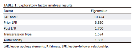 Following a principal component analysis and Oblimin rotation, a five-factor solution emerged. The suitability of the data was assessed using the Kaiser-Meyer-Olkin measure of sampling adequacy, which yielded a result of 0.922 (> 0.6) and Bartlett's test of sphericity, yielding a chi-square of 5838.089 (p < 0.001). Factor 1 included most LAEs (no differential loadings among content, timing and delivery method), fairness (F) and one question from each of accountability and authenticity. These elements were retained as part of Factor 1. Prior LFR loaded on Factor 2, Post LFR on Factor 3, Transgression type on Factor 4 and the remaining authenticity items on Factor 5, these factors were therefore each named as per the elements that loaded on each. The five-factor solution explained 67.182% of the common variance. Albeit the eigenvalue of the first factor proved much higher than that of successive factors', all eigenvalues exceeded 1 (see Table 1).