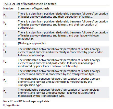 The purpose of the study is to investigate factors influencing followers' perception of the effectiveness of leaders' apologies. The quality of the leader's apology, which includes the leader's (cognitive, affective and conative) apology content, the promptness of the apology and the delivery channel through which it is delivered, serves as an independent variable. Followers' perception is operationalised in two dependent variables, namely firstly, their perception of an apology's authenticity and secondly, their relationship with their leader post-wrongdoing and apology. A final dependent variable to be considered is followers' perception of the fairness of the apology, which is defined as the extent to which the apology is viewed as evidencing distributive, procedural and interactional justice. The moderating variables that are considered include, firstly, the leader-follower relationship (LFR) prior to the wrongdoing, and secondly, the type of transgression. The latter is defined as either intentional or preventable.