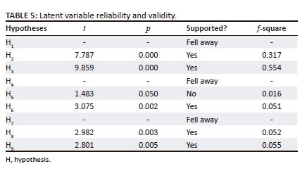 The f-square values reveal large effect sizes for H2 (0.317) and H3 (0.554) and small effect sizes for H6, H8 and H9. Results are summarised against the hypotheses in Table 5.