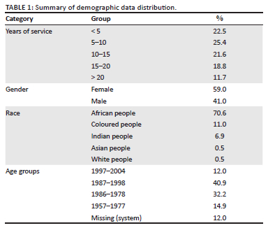 This study focused on South African public sector employees outside the human services, including blue- and white-collar employees, managers and directors. A non-probability sampling method was chosen for convenience, cost-effectiveness and time efficiency. A total of 1447 employees from the Public Services Departments were surveyed, with 252 participating. However, only 218 completed questionnaires were included in the analysis. Table 1 summarises the age, race, gender and years of service of the research participants. The distribution of years of service indicates that 22.5% of the participants had less than 5 years of service, while 25.4% had between 5 and 10 years of service. Those with 10 years to 15 years of service accounted for 21.6%, and 18.8% had between 15 years and 20 years of service. The smallest group, comprising 11.7% of participants, had more than 20 years of service. In terms of gender, 59.0% of the sample were female, while 41.0% were male. The racial composition was dominated by black African participants, who made up 70.6% of the sample. Coloured participants accounted for 11.0%, Indian participants for 6.9% and white and Asian participants each represented 0.5% of the sample. The age distribution revealed that 12.0% of the participants were born between 1997 and 2004, 40.9% between 1987 and 1998 and 32.2% between 1986 and 1978. The smallest group, comprising 14.9%, was born between 1957 and 1977. In addition, 12.0% of the participants did not indicate their age.