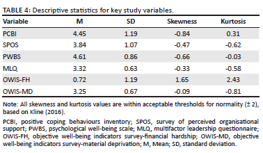 To ensure the integrity and validity of the dataset, a comprehensive preliminary data screening process was conducted prior to analysis. Of the 252 survey responses received, 218 fully completed questionnaires were included in the final analysis. Thirty-four partially completed questionnaires were excluded because of missing responses that could compromise the reliability of the analysis. Within the retained cases, there were no item-level missing data, as participants were required to complete all items before submission. The response rate of 15.1% reflected the voluntary nature of participation and logistical challenges posed during the COVID-19 pandemic. To check for assumptions of normality, skewness and kurtosis values were assessed, with thresholds within the acceptable range of ± 2 and ± 3, respectively (George & Mallery, 2024; Kline, 2005). Multivariate normality was examined through univariate checks, bivariate scatterplots and standardised regression residuals. Outliers were investigated using z-scores (values exceeding ± 3) and Mahalanobis distance to detect multivariate outliers (Babbie & Mouton, 2011; Hayes, 2018). In addition, assumptions of linearity, homoscedasticity, multicollinearity and singularity were assessed using scatterplots, Levene's test, tolerance values, variance inflation factors (VIF), eigenvalues and condition indices. These procedures ensured that the data met the necessary assumptions for multivariate analyses, enhancing the robustness and credibility of the statistical inferences.