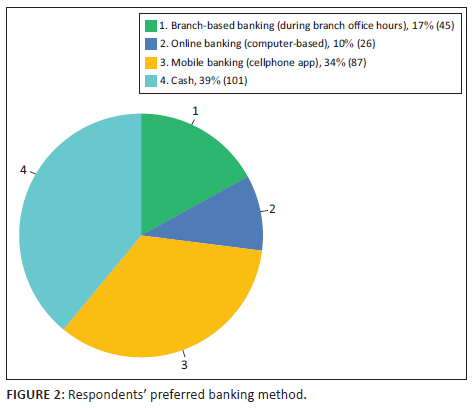 Figure 2 shows the respondents' preferred method of conducting banking activities. Thirty-nine per cent indicated a preference for using cash, followed by 34% mobile banking (cellphone app). Seventeen per cent showed a preference for branch-based banking (during banking office hours), and 10% made use of online banking (computer-based).