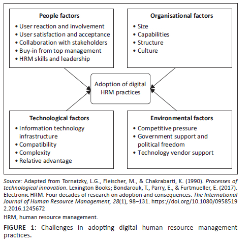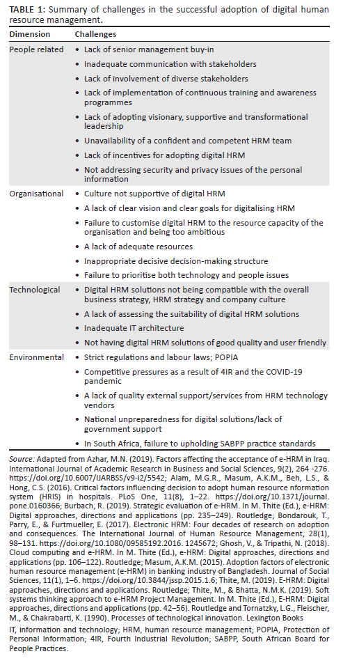 However, there is a lack of empirical studies on the challenges that may impede the adoption of digital HRM practices in the South African workplace (SABPP, 2019). Most studies (although limited) in this domain had been conducted in European countries and developed nations, such as the United States of America, China, Russia and Germany (Bengtsson & Bloom, 2017; Bondarouk et al., 2016; Zavyalova et al., 2022). Identifying and effectively managing challenges that influence the adoption of digital HRM practices are imperative to enhance HRM digitalisation across the entire HR value chain and ensure return on investment in HRM technology. Also, understanding the challenges and being able to preempt them strengthens the position of HRM in planning for and arranging resource requirements for HRM digitalisation (Ulrich, 2018).