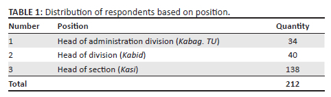 As mentioned here, the research samples totaled 216 respondents consisting of Heads of Administrative Division (Kabag TU), Heads of Division (Kabid) and Heads of Section (Kasi) at 34 Regional Offices (Kanwil) of the Ministry of Religious Affairs. After the selection and verification of submitted questionnaires, as many as 212 samples had met the required criteria as shown in Table 1.