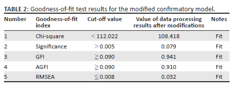 To verify whether the empirical (statistical) model or statistics covariance matrix developed by the researchers is similar to or fitting with the theoretical (parameter) model or parameter covariance matrix, five elements or goodness-of-fit index were used, which are chi-square, significance, the goodness-of-fit index (GFI), adjusted goodness of fit index (AGFI) and the root mean square error of approximation (RMSEA). Results of confirmatory testing after modifying some of the indicators had indicated a result of fit or meeting the required criteria. This means that the empirical model developed in the study is deemed compatible with the theoretical model. Confirmatory factor analysis results are provided in Table 2.