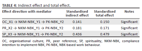 Table 3 shows that each independent variable (organisational culture, peer reference and spirituality) partially has significant direct effect on compliance intention to implement NBK. This is verified with the significance values produced through testing; each variable has a significance level of < 0.05. Nonetheless, the three variables partially have indirect effect on NBK-based work behaviour. This is corroborated by the significance level produced in the testing being > 0.05. Meanwhile, the compliance intention to implement NBK variable has direct effect on NBK-based work behaviour with a significance level < 0.05.