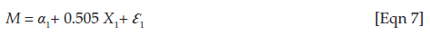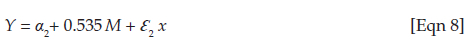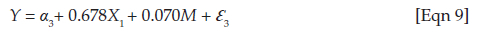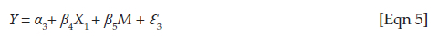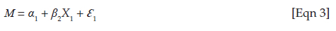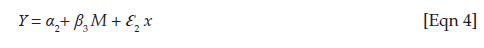 where Y is the dependent variable, α2 is the y intercept, β3 is the regression (beta) coefficient, M is the intervening variable and Ɛ2 is the regression error term.
