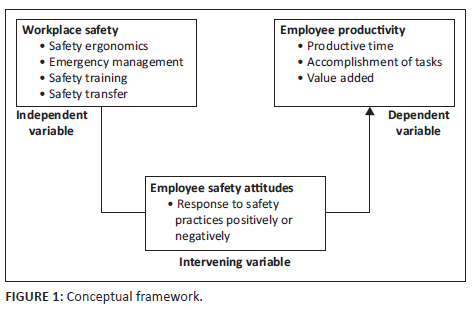 The conceptual framework represents diagrammatically and explains the relationship among independent, intervening and dependent variables. Workplace safety comprising interventions for workplace safety (safety ergonomics, emergency management, safety training and safety transfer) is the independent variable that affects employee productivity, which is the dependent variable. Employee safety attitude is the intervening variable. Based on the reviewed literature, it is postulated that workplace safety would affect employee productivity. Employee safety attitude will intervene in the relationship between workplace safety and employee productivity. Figure 1 depicts the relationships between the pertinent variables.