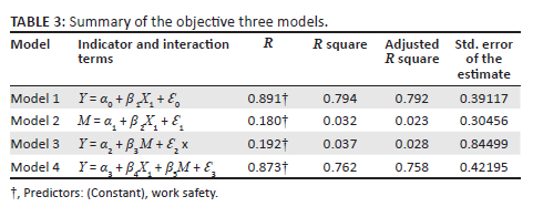 In Table 3, Y is the dependent variable (employee productivity), α0 - α3 are the y intercepts, β1-β5 are the regression (beta) coefficients, X1 is the independent variable (workplace safety), M is the intervening variable (employee safety attitudes) and Ɛ0-Ɛ3 are the regression error terms.