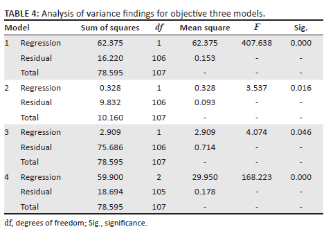 The results for model 3 obtained F(1, 106) = 4.074, p = 0.046 < 0.05, implying that the model used to link the dependent variable and the potential intervenor is statistically significant. Lastly, the results for model 4 obtained F(1, 105) = 168.223, p = 0.000 < 0.05, implying that the model used to link the dependent variable, independent variable and the potential intervenor is statistically significant; thus, the null hypothesis which stated that work safety and employee safety attitude have no statistically significant effect in employee productivity is rejected, and a conclusion is drawn that work safety and employee safety attitude affect employee productivity significantly.