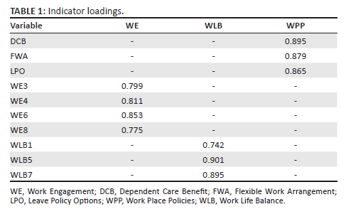 The measurement model evaluation involved confirmatory factor analysis, indicator loadings, reliability and validity. The model was assessed in order to determine the suitability of the indicators used to measure HR policies, employee engagement and work-life balance. According to Kim (2016), an indicator is suitable if its outer loading is more than 0.7.