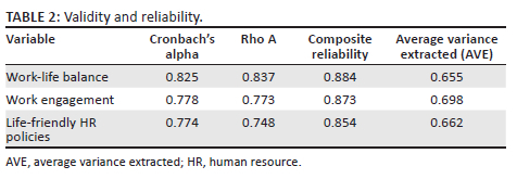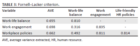 The values in Table 3: life-friendly HR policies (0.814), employee engagement (0.835) and work-life balance (0.810) indicate that the square root of each construct's AVE is larger than the correlations among them (Hair et al., 2016). As all the indicator loadings were higher than the cross-loadings, the model meets the requirements of discriminant validity.