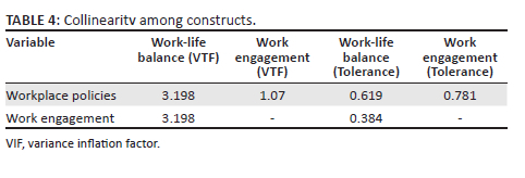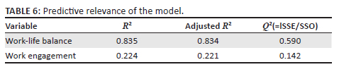 The absence of common bias was further confirmed by the variance inflator factor result, which was equal to 3.198. Having a VIF value greater than 3.3 means that the results are tainted by common method bias (Hair et al., 2016). As all the VIF values in the collinearity test were 3.3 or below (3.198), this signifies that the model is devoid of collinearity and common method bias. The endogenous variable's predictive power was also evaluated, and the coefficient of determination (R2) for the work-life balance (the endogenous latent variable) was 0.835. This means that the two latent constructs accounted for 83.5% variation in staff's work-life balance as indicated in Table 5 and Figure 2. Workplace policies, on the other hand, explained 22.4% of the variation in employee engagement, as indicated in Figure 2.