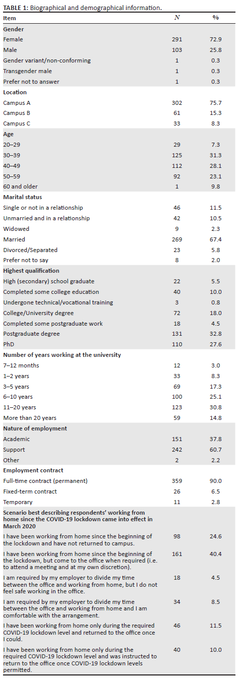 From Table 1 it is evident that more women (72.9%) than men (25.8%) participated in the research. The most responses were received from Campus A (75.7%), followed by Campus B (15.3%) and Campus C (8.3%). The majority of the respondents were between 30 and 59 (82.5%) years old and were married (67.4%). Eighteen per cent of the respondents had a college or university degree, 32.8% a postgraduate degree and 27.6% a PhD degree. In total, 70.7% of the respondents had worked for the university for 6 years and longer. The majority of the respondents were employed in support positions and 37.8% in academic positions. A large majority (90%) of the respondents were employed in full-time contracts. During the research period, most of the respondents (40.4%) had been working from home since the beginning of the lockdown, but came to the office when required and 24.6% who had been working from home had not returned to campus.