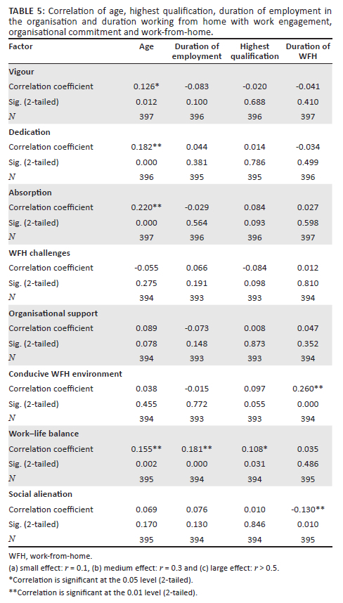 The results showed small to moderate positive correlations between age and Vigour (p = 0.012, r = 0.126), Dedication (p = 0.000, r = 0.182) and Absorption (p = 0.000, r = 0.220). Furthermore, small to moderate positive correlations were found between Work-life balance and age (p = 0.002, r = 0.155), highest qualification (p = 0.031, r = 0.108) and duration of employment (p = 0.000, r = 0.181). The results revealed a small to moderate positive correlation between duration working from home and Conducive WFH environment (p = 0.000, r = 0.260) and a small to moderate negative correlation with Social alienation (p = 0.010, r = -0.130).