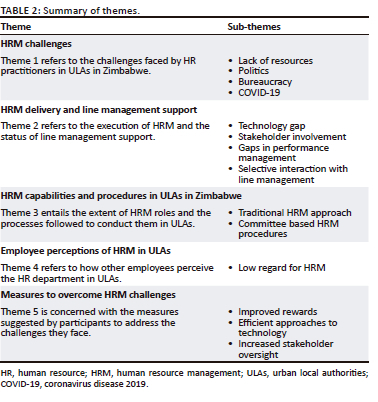 The purpose of this study was to explore the lived experiences of HR practitioners in fulfilling their roles in ULAs in Zimbabwe, focusing on confronting the challenges that prevent them from fulfilling their roles. Five major themes and a number of sub-themes were identified as essential issues in ULAs in Zimbabwe through an inductive process of thematic analysis. The major themes were: (1) HRM challenges, (2) HRM delivery and line management support, (3) HRM capabilities and procedures in ULAs in Zimbabwe, (4) employee perceptions of HRM in ULAs and (5) measures to overcome HRM challenges. The themes are listed in Table 2 according to which came up the most to which came up the least.
