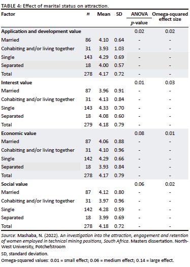 The ANOVA test revealed statistically significant results for application and development value (p = 0.02) and interest value (p = 0.01). The post hoc test using Tukey B revealed that none of the group means for marital status differed significantly from one another, as all groups fell within the same homogeneous subset. Furthermore, the omega-squared effect sizes were small. Therefore, it can be deduced that the marital status of women in technical mining positions did not affect their perceptions of attraction when considering a potential employer.