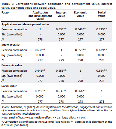 The application and development value factor loaded nine items, with a factor mean of 4.174. The interest value factor loaded four items, with a factor mean of 4.179. The economic value factor loaded five items, with a factor mean of 4.173. With a factor mean of 4.180, the social value factor loaded seven items. These mean scores indicate that application and development, interest, economic and social values are all critical factors for attracting women to technical positions in mining.