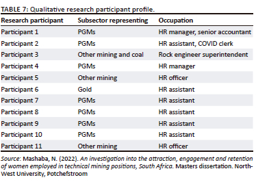 Education and the position occupied by respondents were the two inclusion criteria used for the quantitative sampling. Regarding education, women were required to have a qualification in mining or a field closely related to mining that was higher than a matric (Grade 12). However, provision was made for respondents who had recognition of prior learning (RPL). Some women did not have a qualification in mining but had work experience in technical positions. Respondents with those traits were included in the study. The occupational inclusion criteria included women employed in technical positions such as geology, mining engineering, metallurgical engineering, chemical engineering, electrical engineering, analytical chemistry, mine surveying and jewellery design and manufacturing. However, women who were not employed in technical positions at the time of data collection but had prior work experience in those roles could participate in the study. These women might have transitioned to less technical positions because of reasons such as pregnancy, injuries or other health-related issues. Women who held nontechnical positions or lacked prior work experience in technical positions or a post-matric or mining-related qualification were excluded from the study.