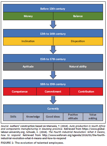 Figure 1 illustrates how the meaning attached to talent has evolved over time. In previous centuries talent was equated with money, inclination and aptitude (Schwab, 2018); in the 18th and 19th centuries the focus moved to competence, commitment and contribution (Marwala, 2018), while with Industry 4.0 the focus is on skills, knowledge, good ideas (innovation), a positive attitude (resilience), and ultimately adding value to the strategic goals of the organisation (Schwab, 2018).
