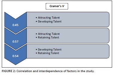 Correlation, chi-square test and Cramer's V analyses suggested strong relationships and dependence among the factors, and specifically between Attracting Talent and Developing Talent, and between Attracting Talent and Retaining Talent. The correlation and interdependence of factors in this study can be seen in Figure 2. The results suggested that talent management starts with drawing talent into the organisation, then developing and retaining talent. This could be understood in two ways. Firstly, talented people must be drawn into the organisation, their skills must be further developed and updated, and they need to be retained for continuity of excellence, innovation and knowledge retention within the organisation. All three of these factors are important for talent management in Industry 4.0 and a holistic and integrated strategy needs to be planned and implemented to ensure organisational competitiveness. Secondly, employing exceptional employees and providing them with excellent development opportunities and a positive employee experience create a positive organisational brand and image, which in turn will attract talented recruits. These results concur with that of Irudayaraj (2018) and Bussin (2014) who suggested that no single organisational or HRM activity can stand alone, but rather that all HR activities should be holistically integrated with the focus on meeting the goals of the organisation. Klimova (2016) suggested that both an inclusive and exclusive approach should be followed in talent development, meaning that all employees should be regarded as talent (i.e., inclusive approach), and specific talent identified, utilised and further developed (i.e., exclusive approach). Employees specifically appointed to fill emerging job categories requiring exceptional creativity associated with Industry 4.0 should be exposed to sophisticated learning opportunities in relation to their roles.