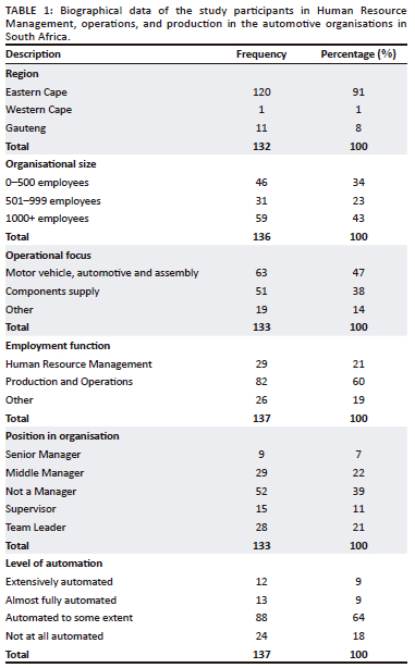 As stated, the target population of the study was employees in HRM, as well as in operations and production in South African automotive organisations. The questionnaire was viewed by 526 potential participants and submitted by 162 participants, while 137 were identified as useable for data analysis, providing a response rate of 26%.