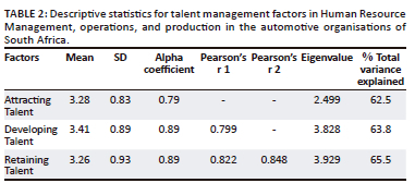 The mean scores, standard deviations, Cronbach's alpha coefficients and correlations for the Talent Management Factors are reported in Table 2.