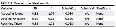 The one-sample t-test revealed (Table 3) that no practical or statistically significant differences were found in terms of Attracting Talent (SD = 0.83, p = 0.084, d = n/a), Developing Talent (SD = 0.89, p = 0.896, d = n/a), and Retaining Talent (SD = 0.93, p = 0.088, d = n/a). The Cohen's d was below 0.20 for all factors, while the Scheffé's p-value was higher than 0.05 for all factors. The conclusion was drawn that a fair level of homogeneity existed within the sample and the results could be confidently generalised to the population (Hair et al., 2011).