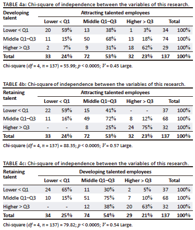 In addition, chi-square (χ2) tests were carried out to determine whether statistically significant relationships existed between the various factors measured in this study; while the Cramer's V determined the practical significance of the relationships (Cassim, 2011; Saunders et al., 2011). A statistically significant relationship was found between Attracting Talent and Developing Talent (p < 0.0005, χ2 = 55.99, df = 4). It is also evident in Table 4 that the practical significance of this relationship was large (Cramer's V = 0.45). A statistically significant relationship was also observed between Attracting Talent and Retaining Talent (p < 0.0005, χ2 = 88.35, df = 4), with a large practical significance (Cramer's V = 0.57). A statistically significant relationship between the variables of Developing Talent and Retaining Talent (p < 0.0005, χ2 = 79.82, df = 4) was evident (see Table 4), with a large practical effect (Cramer's V = 0.54). These results suggested that the magnitude of the relationships between the variables are important moving forward. An integrated and unified approach to talent management is therefore essential to meet talent needs in Industry 4.0.
