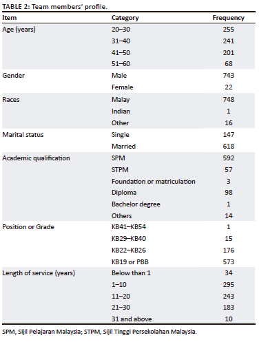 Out of the 850 respondents, 85 individuals were identified as team leaders, while the remaining 765 were classified as team members. The group of team leaders comprised officer commanders and in-charge personnel from the Fire and Rescue stations. The profiles of these respondents were categorised into two groups: team leaders and team members. Detailed profiles of team leaders and team members can be found in Table 1 and Table 2, respectively.