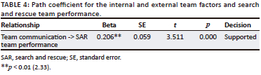 A mediating variable is a subsequent variable in a causal relationship between independent variables and dependent variables. Mediation effects will happen from an external effect on an internal relationship. The findings of the indirect mediation analysis indicated that team motivation does not mediate the relationship between team communication and SAR team performance. The path coefficient for the indirect effect was not significant, indicating that team motivation did not mediate the relationship between team communication and SAR team performance. In other words, the relationship between team communication and SAR team performance was not explained by team motivation. There are a number of possible interpretations for these results. One possibility is that team motivation is not a strong enough mediator to explain the relationship between team communication and SAR team performance. Another possibility is that there are other factors that are mediating the relationship between team communication and SAR team performance. Detailed results can be found in Table 5.