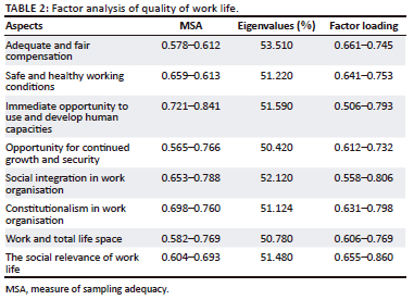 The QWL scale was compiled based on the following aspects of QWL proposed by Walton (1973): adequate and fair compensation, safe and healthy working conditions, immediate opportunity to use and develop human capacities, an opportunity for continued growth and security, social integration at work, constitutionalism in the organisation of work, work and total living space, and social relevance of work life. Factor analysis is shown in Table 2, and the alpha coefficient of reliability is 0.94.