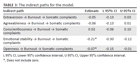 There were two meaningful indirect effects present in the model. The first was the relationship from emotional stability to somatic complaints through burnout (β = −0.21; 95% CI [−0.30, −0.12]), and the second from openness to somatic complaints through burnout (β = -0.07; 95% CI [−0.15, −0.01]).