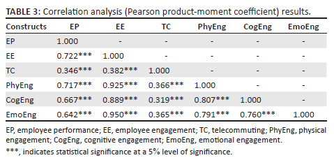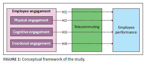 ORIENTATION: The coronavirus disease 2019 (COVID-19) pandemic accelerated the adoption of telecommuting (TC), but its effect on the relationship between employee engagement (EE), its dimensions and employee performance (EP) remains unclear.