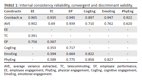 This study measured the respondents' perception of EE through a 16-item scale developed by Rich et al. (2010) that comprises three dimensions, namely, PhyEng (five items), CogEng (five items) and EmoEng (six items). Telecommuting was assessed using a six-item scale adapted from Green (2019). Employee performance was appraised through a 22-item scale developed by Pradhan and Jena (2017). The internal consistency reliability, convergent and discriminant validity pertaining to EE, along with its constituent dimensions, TC, and EP results of the analyses are presented in Table 1.