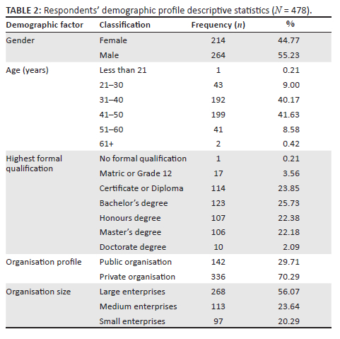 The demographics of interest to this study were gender, age, highest formal qualification, organisation profile and organisation size. As presented in Table 2, most of the respondents worked in private sector organisations, which accounted for 70% (n = 336), while 30% (n = 142) of the respondents worked in the public sector. In addition, the majority of the employees were employed by large enterprises (56.07%, n = 268), followed by medium enterprises (23.64%, n = 113) and small enterprises (20.29%, n = 97).