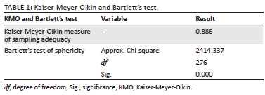 As this sample was a census of an entire small population (200) rather than a small random sample of a large population (response rate 81.5%), we used the Kaiser-Meyer-Olkin (KMO) test and Bartlett test (Chan & Idris, 2017; Field, 2018) to measure for sampling adequacy. The KMO score (0.886) indicates that the realised sample (Table 1) was judged large enough for further analysis, including factor analysis.