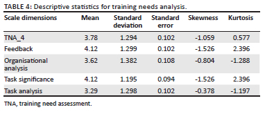 To address RQ1, descriptive statistics (means, standard deviations, skewness and kurtosis) were calculated. Then, Pearson correlation tests were used to examine relationships between the training needs analysis process and talent management practices (Field, 2018). Table 4 and Table 5 present the descriptive statistics of training needs analysis and talent management.