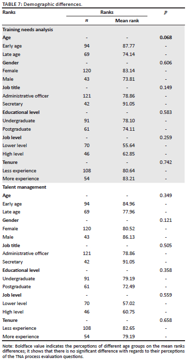 The results presented the overall training needs analysis and talent management mean scores, using a 0.05 cut-off point. For example, the p-value of 0.068 is greater than the critical value of 0.05. Therefore, the perceptions of different age groups, gender (0.606), job title (0.149), educational level (0.583), job level (0.742) and tenure (0.658) on the mean rank differences show there are no significant differences in their perceptions of the training needs analysis and talent management practices reported (Table 7). It is worth mentioning that although not significant, the early career group showed a higher need for training needs analysis (87.77) than the late-career group (74.14). This indicates that the early-career group had a slightly more pronounced awareness and need for their training needs to be acknowledged than the late-career group. The p-value (0.068) is close to the cut-off point of 0.05.