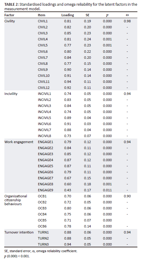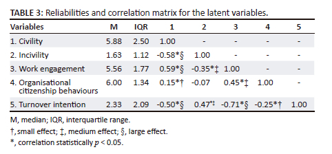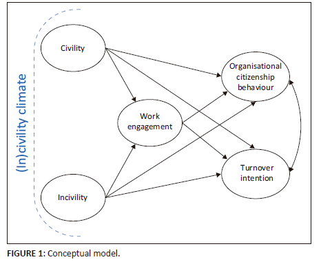 Ayanda (2016) describes incivility as discourteous behaviour lacking concern or respect. The researcher expanded it to encompass various negative behavioural tendencies, such as disrespect, demeaning or belittling others, ineffective or poor communication, a general deficit of people skills and an overall lack of accountability for one's role, others and the organisational community. Findings from Harrilall (n.d.) indicated that civility is not solely defined by the absence of incivility, but rather by the presence of positive behaviours that epitomise accountability and discipline of oneself relative to one's role, team and organisation. Moreover, within the framework of this redefined concept, civility extends beyond mere courteous behaviour to encompass altruistic endeavours directed towards the betterment of others. Within this paradigm, individuals extend themselves in service to others, manifesting care, compassion and concern. They honour others through their interactions and remain connected to and actively engage in actions that benefit the community. The inclusion of additional items that measure this broadened definition of (in)civility, in this study, has the potential to enhance the explanatory power of work engagement, organisational citizenship behaviour (OCB) and turnover intention. Previous studies have shown relationships between (in)civility and turnover intention (Namin et al., 2021; Paulin & Griffin, 2017), work engagement (Abid et al., 2018; Gümüştaş & Karataş Gümüştaş, 2022; Gupta & Singh, 2020; Smidt et al., 2016; Tricahyadinata et al., 2020) and OCB (Liu et al., 2019; Patterson, 2016). Notably, Smidt et al. (2016) and Vink and Adejumo (2015) were the only studies conducted in South Africa, with Smidt et al. (2016) focussing specifically on the financial services sector.